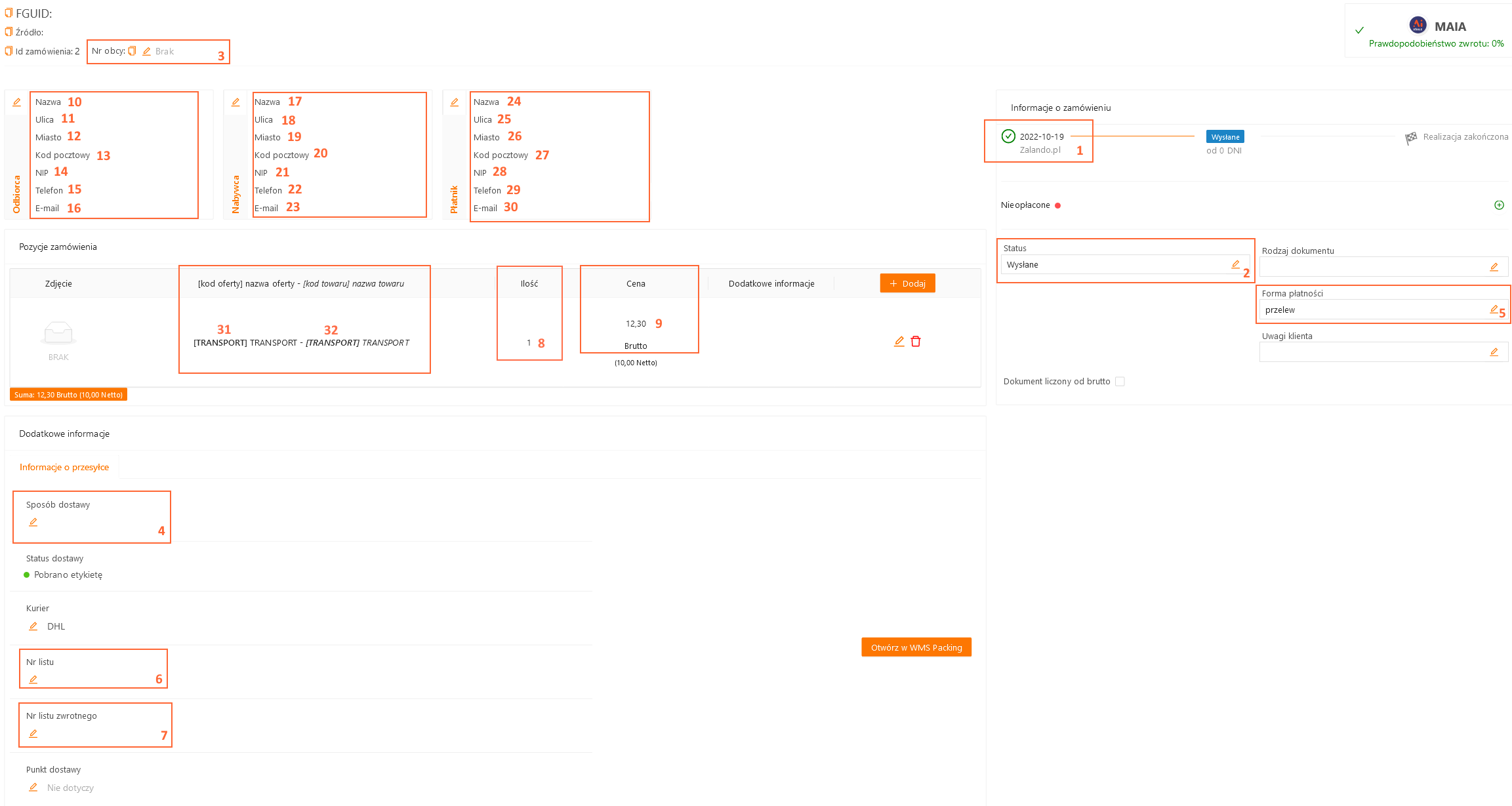 | Edycja zamówienia > Formularz zamówienia > Nabywca | 23 | Orders > Manage Orders > Shiping details > Shipping addres | Adres email zwracany przez API jest zaszyfrowany przez Zalando | |||