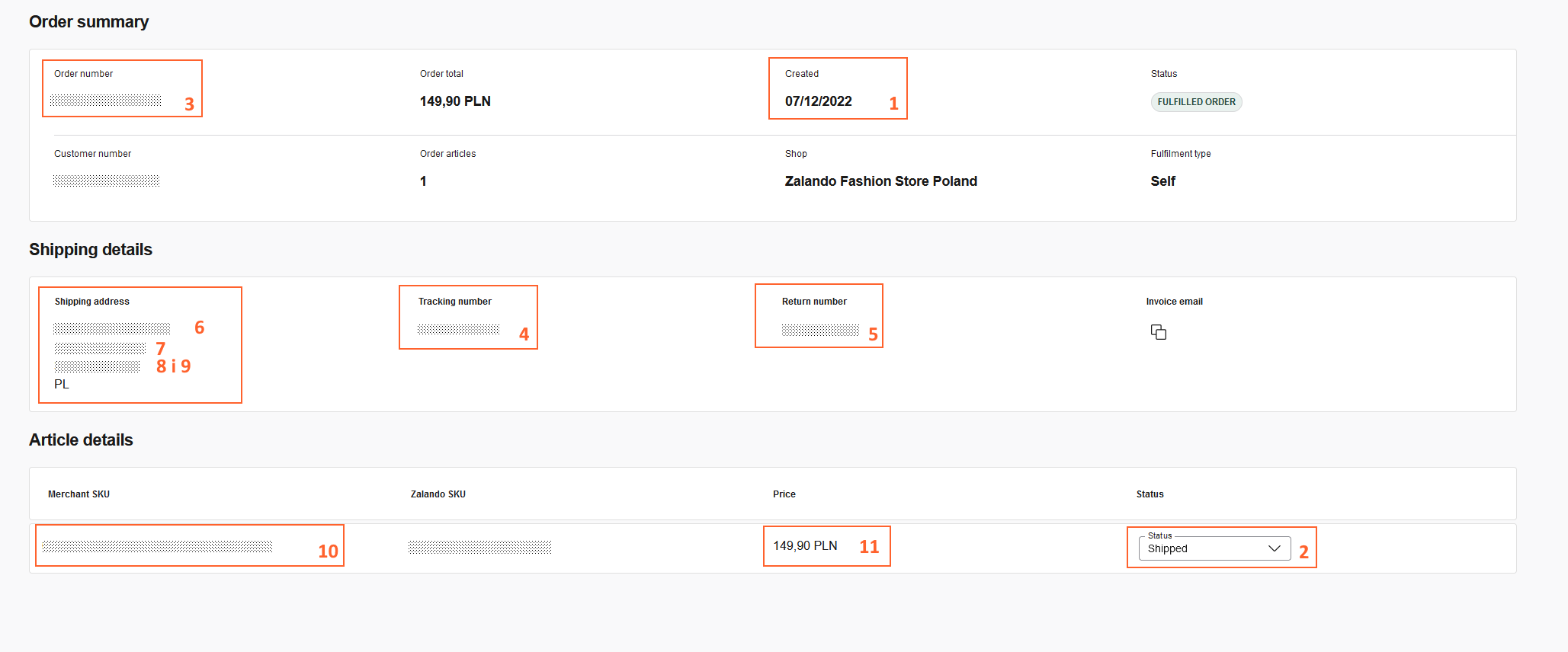 | Edycja zamówienia > Formularz zamówienia > Informacje o przesyłce | Nr listu | 6 | Orders > Manage Orders > Shiping details > Shipping addres | Tracking number | 4 | xSale przekazuje do Zalando numer listu przewozowego wygenerowany do zamówienia |