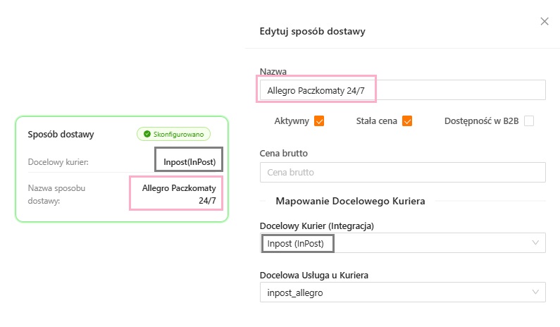 Dodając nowy sposób należy pamiętać, żeby uzupełnić w nim wartość dla pola Docelowy Kurier, ponieważ bez tego Konfigurator nadal będzie wskazywał błąd.