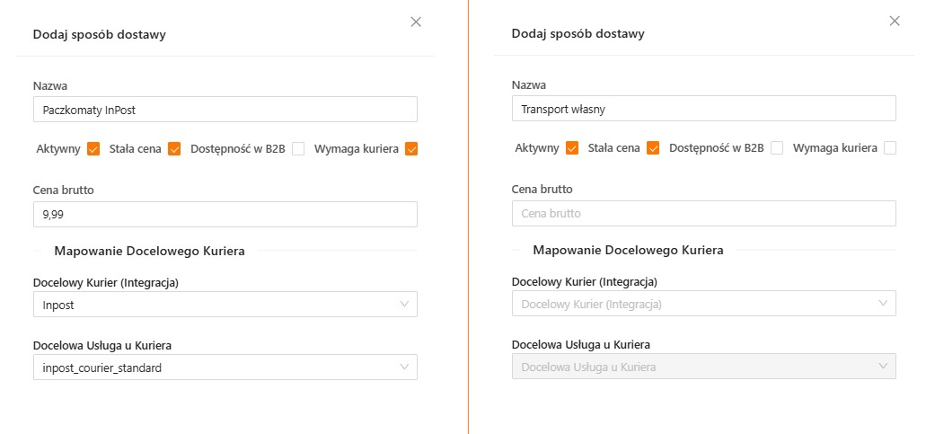Dlatego dla takich sposobów dostaw jak np. odbiór osobisty czy transport własny, nie jest wymagany uzupełniony Docelowy Kurier – należy więc odznaczyć flagę „Wymaga kuriera”. Tylko takie odznaczenie sprawi, że dla zamówień z takim sposobem dostawy, w drugiej kolumnie Konfiguratora, nie będzie wyświetlał się błąd.