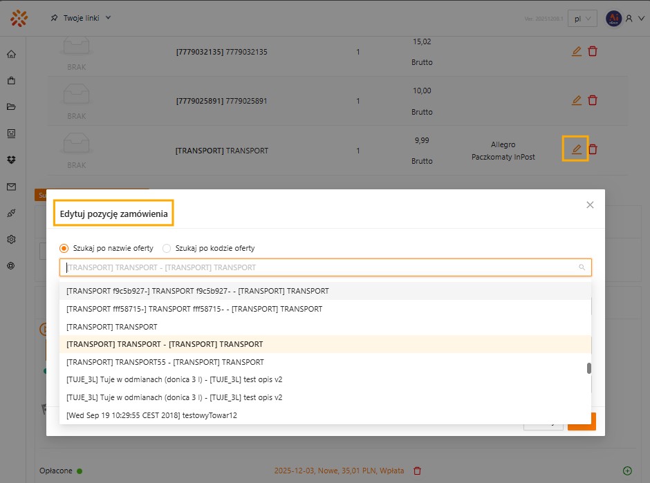 Po weryfikacji danych we wszystkich 3 kolumnach w Konfiguratorze, należy wrócić do edycji zamówienia, odnaleźć na liście pozycji tą z transportem i kliknąć ołówek. Następnie podmienić pozycję zamówienia na tą właściwą, która ma być wysyłana do ERPa jako usługa transportowa.