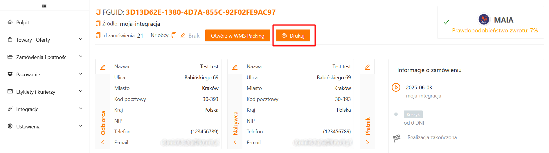 Plik PDF z wydrukiem możesz pobrać również z widoku zamówienia. Przycisk Drukuj jest dostępny w górnej części okna, nad danymi kupującego.