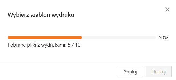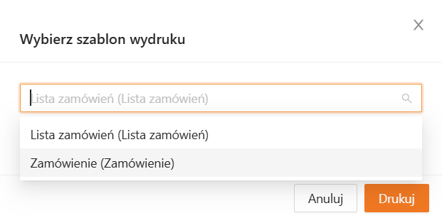 Aplikacja wyświetli okno, w którym możesz wybrać szablon używany do stworzenia wydruku. Uruchamiając wydruk z widoku listy zamówień masz możliwość wydruku informacji o wielu zamówieniach w jednym pliku PDF (typ szablonu Lista zamówień) lub pobrania wielu plików oddzielnie z danymi pojedynczego zamówienia (typ szablonu Zamówienie).