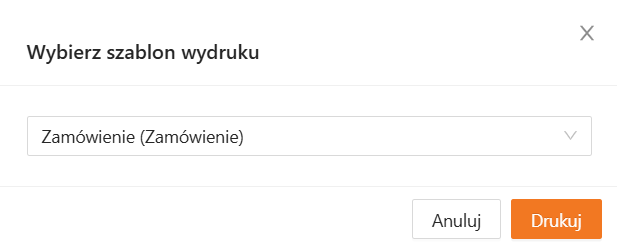 Po jego kliknięciu zobaczysz okno umożliwiające wybór szablonu używanego do stworzenia wydruku. Wydruk z widoku zamówienia umożliwia pobranie pliku PDF z danymi pojedynczego zamówienia (typ szablonu Zamówienie).
