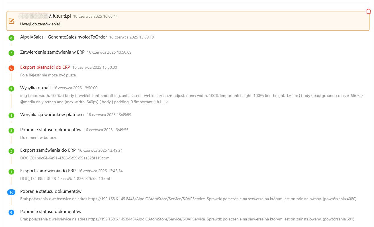 Wpisy w historii zawierają informacje o dacie i czasie realizacji zadania oraz szczegóły dotyczące zrealizowanych procesów. Dzięki takiej formie dokumentacji xSale umożliwia przegląd i śledzenie poszczególnych etapów realizacji zamówienia, a także weryfikację ewentualnych błędów lub przestojów.