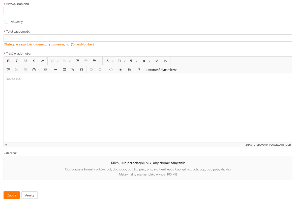 - Załączniki – do każdego szablonu możesz załączyć pliki, które będą wysyłały się wraz z wiadomością, np. Regulamin sklepu.