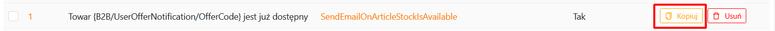Możesz łatwo utworzyć nowy szablon na bazie istniejącego, dzięki opcji kopiowania. Przejdź na listę szablonów e-mail i kliknij przycisk Kopiuj – wszystkie elementy oryginalnego szablonu zostaną przeniesione do nowego szablonu.