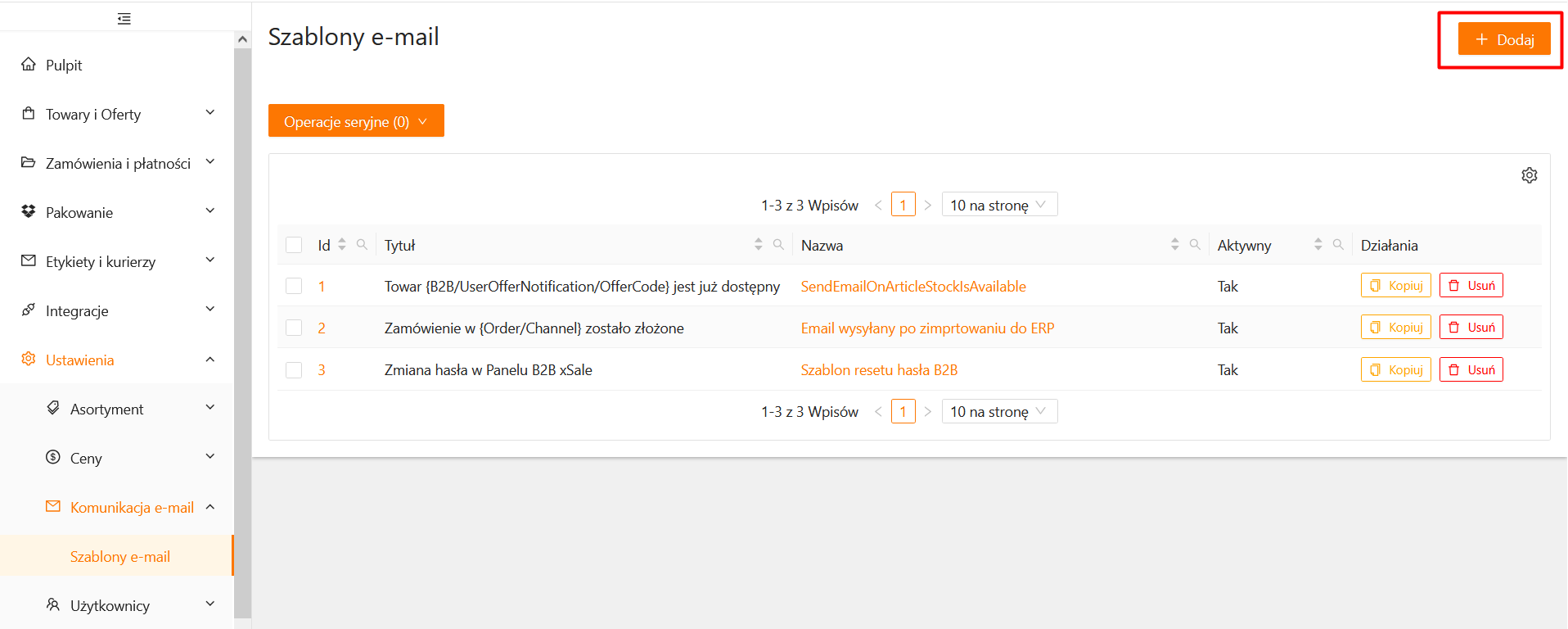 Lista szablonów jest dostępna w zakładce Ustawienia – Komunikacja e-mail – Szablony e-mail. Aby dodać nowy szablon, kliknij przycisk +Dodaj w prawym górnym rogu.