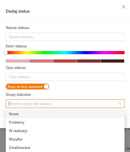 Aby dodać nowy status, kliknij przycisk +Dodaj. Następnie wprowadź nazwę statusu i krótki opisu oraz ustaw kolor, który będzie wyświetlany przy statusie na liście zamówień.