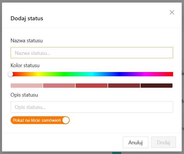 Aby dodać nowy status, kliknij przycisk +Dodaj. Następnie wprowadź nazwę statusu i krótki opisu oraz ustaw kolor, który będzie wyświetlany przy statusie na liście zamówień.