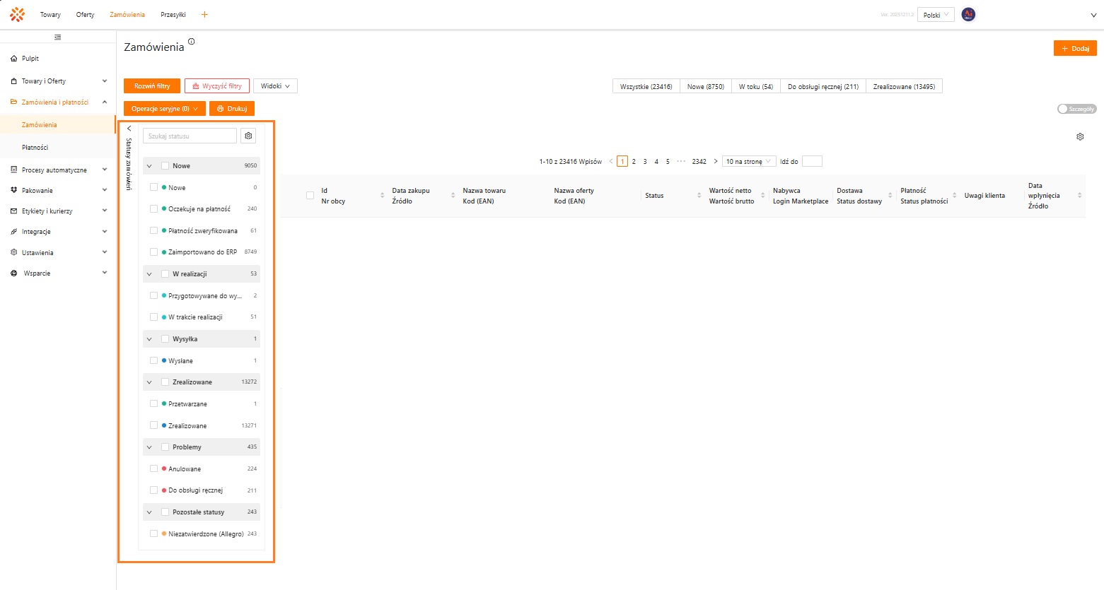 Statusy zamówień działają równolegle z całym panelem filtrów dostępnych na liście zamówień.