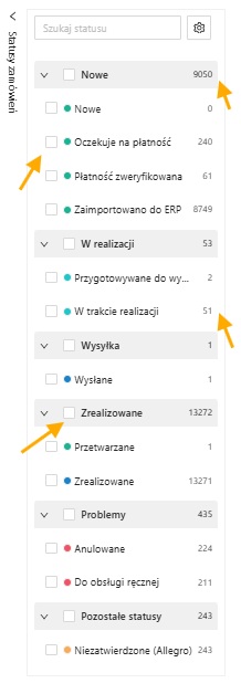 Zaznaczenie danego statusu, jego kliknięcie sprawia, że lista zamówień zostaje za filtrowana do tylko tych w danym statusie. Jest możliwość zaznaczenia wielu z listy statusów. Dodatkowo jest możliwość zaznaczenia filtrowania całej grupy statusów.