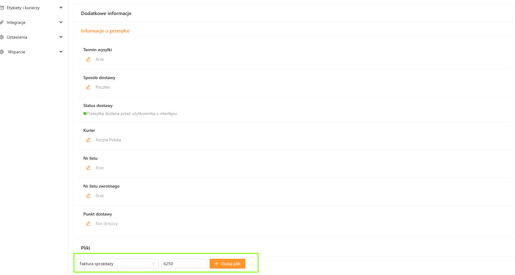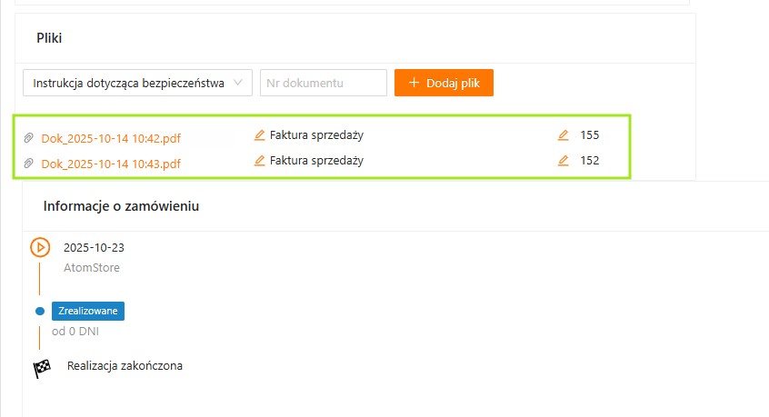 Po dodaniu dokumentu pojawi się on w widoku zamówienia:
