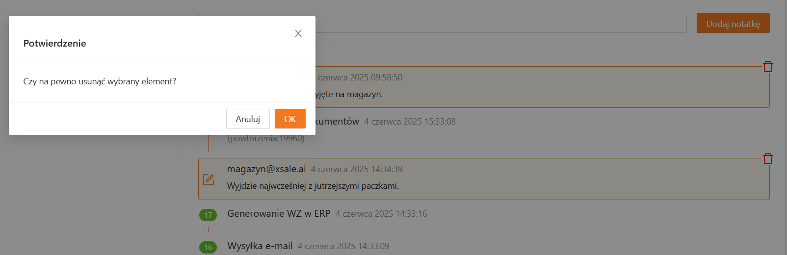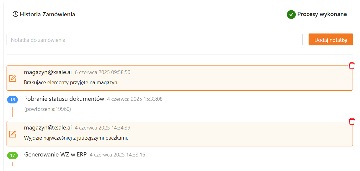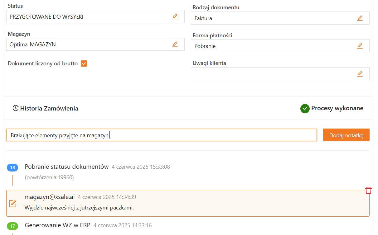 Dodane notatki wyświetlane są razem z logami historii zamówienia, posortowane chronologicznie. Dzięki temu w prosty i przejrzysty sposób będziesz mógł śledzić pełną historię zamówienia – zarówno dodane notatki, jak i wszystkie procesy wykonywane na danym zamówieniu.