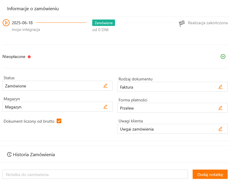Historia zamówienia zawiera chronologiczny zapis zdarzeń i działań związanych z zamówieniem. Ta część została szczegółowo omówiona w oddzielnym wpisie.