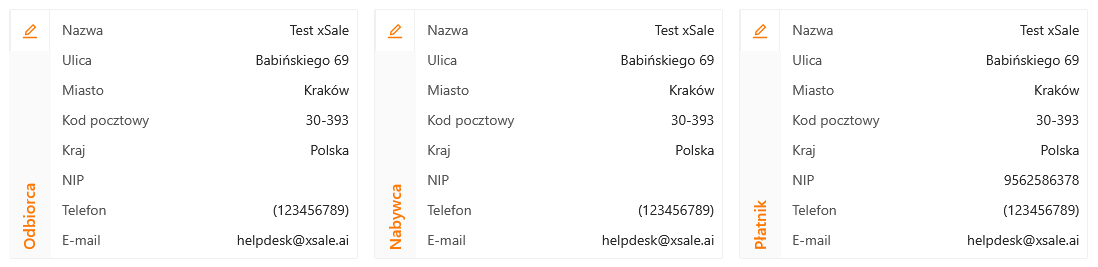 We wszystkich 3 przypadkach dane są edytowalne z poziomu karty zamówienia. Po naciśnięciu na symbol ołówka w lewym górnym rogu możemy edytować dane z wybranej sekcji. Akronim kontrahenta to unikalny kod składający się z 20 znaków.