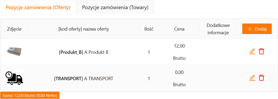 Dostępne są dwa widoki, oferty i towaru. W widoku oferty znajdują się takie informacje jak zdjęcie oferty, kod oferty, nazwa oferty, ilość, cena jednostkowa, dodatkowe informacje oraz suma.