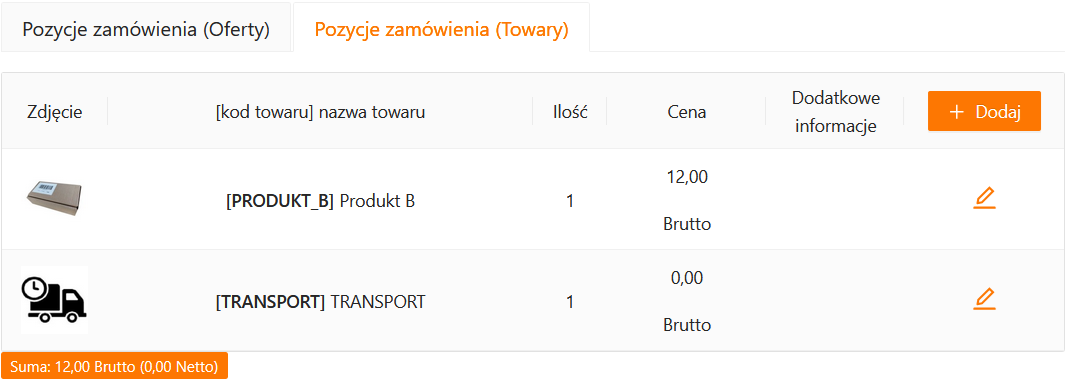 W widoku towaru znajdują się takie informacje jak zdjęcie towaru, kod towaru, nazwa towaru, ilość, cena jednostkowa, dodatkowe informacje oraz suma.
