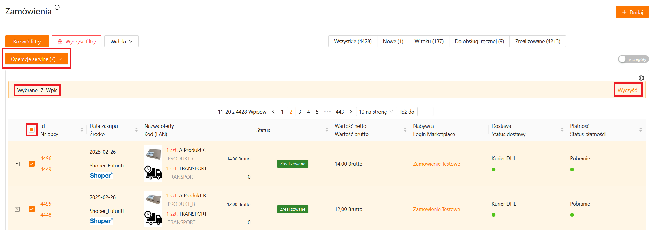 Aby wykonać operację seryjną zaznaczamy na liście zamówień pozycje, na których chcemy dokonać zmiany. Możemy wybrać zamówienia pojedynczo lub całymi stronami. Możemy też odznaczyć całą stronę za pomocą przycisku „Wyczyść”. Widoczna jest też ilość zaznaczonych pozycji na wszystkich stronach.