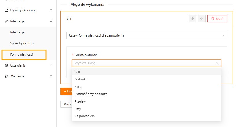 Ustawiając tą akcję mamy możliwość wskazania formy płatności jaka ma zostać ustawiona na zamówieniu po prawidłowym wykonaniu się tego procesu. Lista dostępnych form płatności pochodzi z wcześniej ustawionych: Integracje -> Formy płatności.