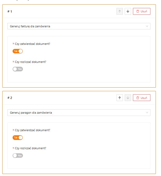 Dodając nowy szablon procesu automatycznego istnieje możliwość ustawienia wielu akcji jednocześnie oraz wskazania w jakiej kolejności mają się wykonywać. Kolejność ustawia się strzałkami góra-dół. A dodawane akcje są ponumerowane według tej kolejności.
