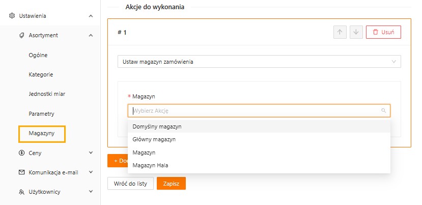 W Ustawienia -> Asortyment -> Magazyny, mamy zdefiniowane magazyny, które możemy wybierać w akcji Ustaw magazyn zamówienia. Wskazując w akcji 1 magazyn, po spełnieniu określonych warunków w procesie, magazyn zostanie ustawiony na danym zamówieniu.