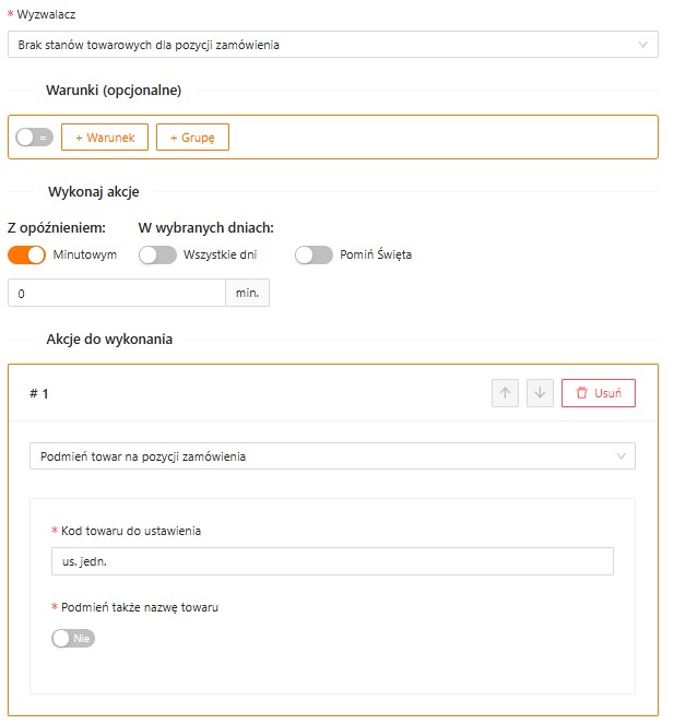 2) Wyzwalacz: Brak stanów towarowych dla pozycji zamówienia -> Warunki i Akcja dowolna