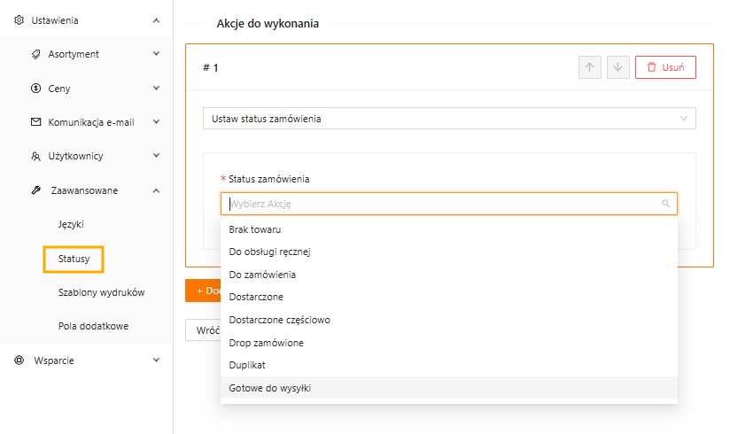 Często wykorzystywaną akcją jest Ustaw status zamówienia, w niej mamy możliwość wskazania jednego statusu, który ma zostać ustawiony na zamówieniu, które spełniło określone warunki. Aby wskazać status w tej akcji, wcześniej musi on być dodany w sekcji Zaawansowane -> Statusy.