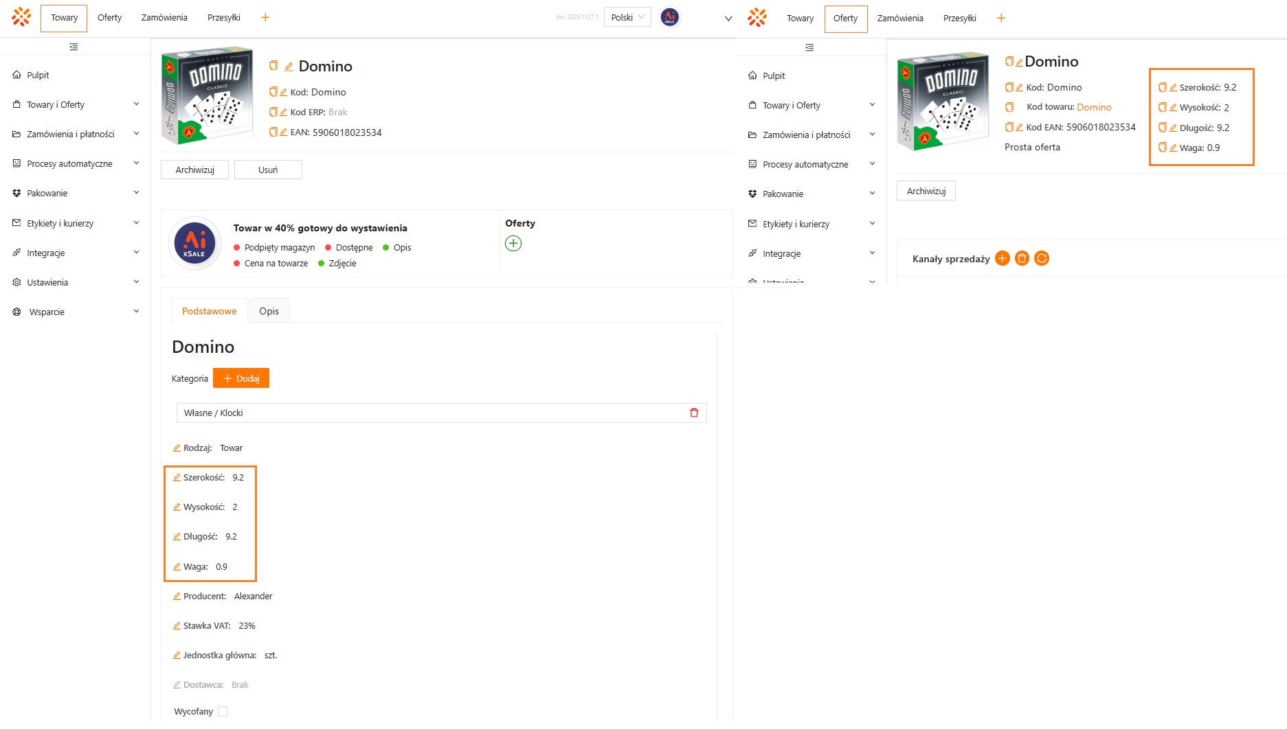 Początkowy wyzwalacz sprawia, że proces zadziała w momencie, kiedy nastąpiła jakaś zmiana i zapis danych na towarze (np. w przypadku wymiarów towarów zapisywanych w ERP Comarch XL – Atrybuty -> Wymiary: Szerokość, Wysokość, Długość, Waga). Jeżeli na towarze będziemy mieli dane w polach: szerokość, wysokość, długość, waga – to dokładnie wartości z tych pól na towarze zostaną przeniesione do pól o tych samych nazwach, występujące na ofercie. Działa to tylko dla ofert prostych.