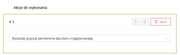 Jest to akcja, w której nie wskazujemy żadnej innej wartości. Jej zadaniem jest wyszukać pozycje z zamówienia bez stanu magazynowego i je oznaczyć. Dzięki temu może zadziałać wyzwalacz Brak stanów towarowych dla pozycji zamówienia.
