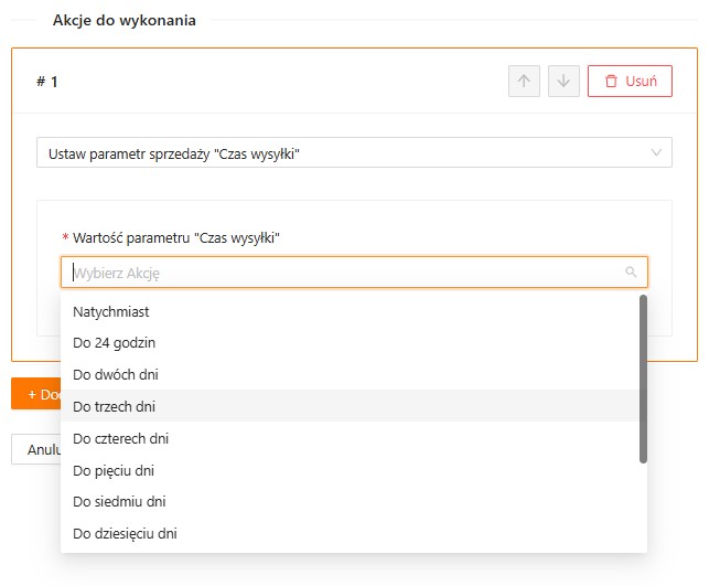 Akcja ta ma związek z towarem, dlatego w momencie jej wykonania ustawi się wybrana wartość dla parametru „Czas wysyłki” na towarach, które spełniły określone warunki. Wybierając tą akcję należy wybrać z listy 1 wartość parametru. Lista odwołuje się do tych samych wartości, które