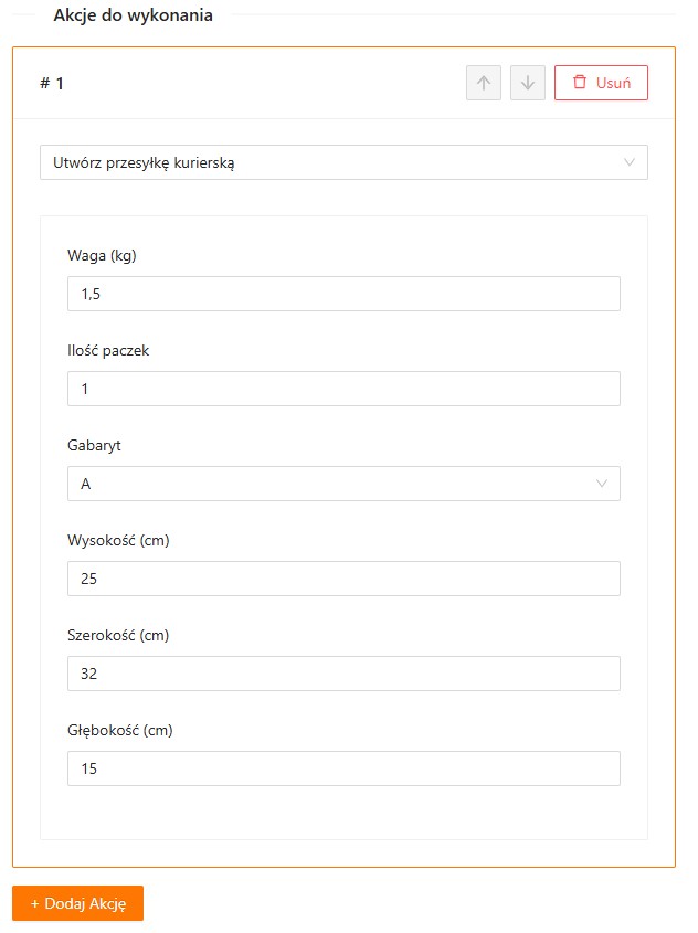 Definiując akcję, która tworzy przesyłkę kurierską istnieje możliwość wpisania wartości dla: wagi, ilości paczek, gabarytu, wysokości, szerokości, głębokości. Waga jest wyrażona w kilogramach, a wymiary w centymetrach. Wszystkie pola są opcjonalne do wypełnienia.