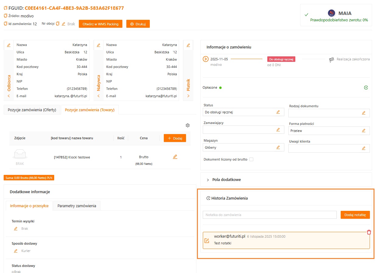 Proces automatyczny zakończy się akcją dodającą notatkę do zamówienia i efekt tego działania możemy zobaczyć na zamówieniu, dla którego zadziałał wyzwalacz, spełnione zostały warunki. Wówczas w sekcji „Historia zamówienia” widoczna jest notatka, o treści, którą podaliśmy w szablonie procesu.