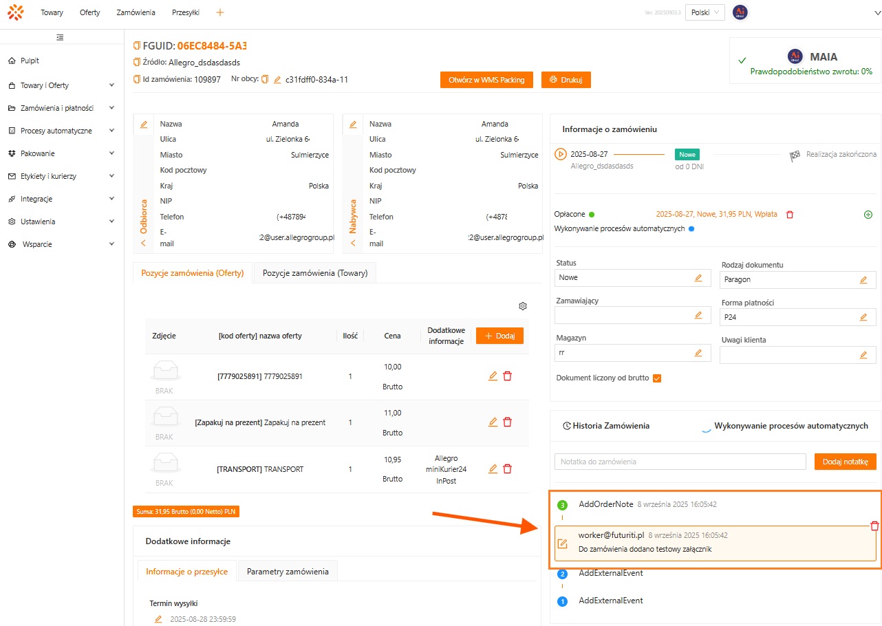Poniżej przykład dodania notatki do zamówienia, gdzie wyzwalaczem było dodanie załącznika do zamówienia. Na zamówieniu widoczny jest zapis, że wykonał się proces automatyczny i zaplanowana notatka pojawiła się na zamówieniu.