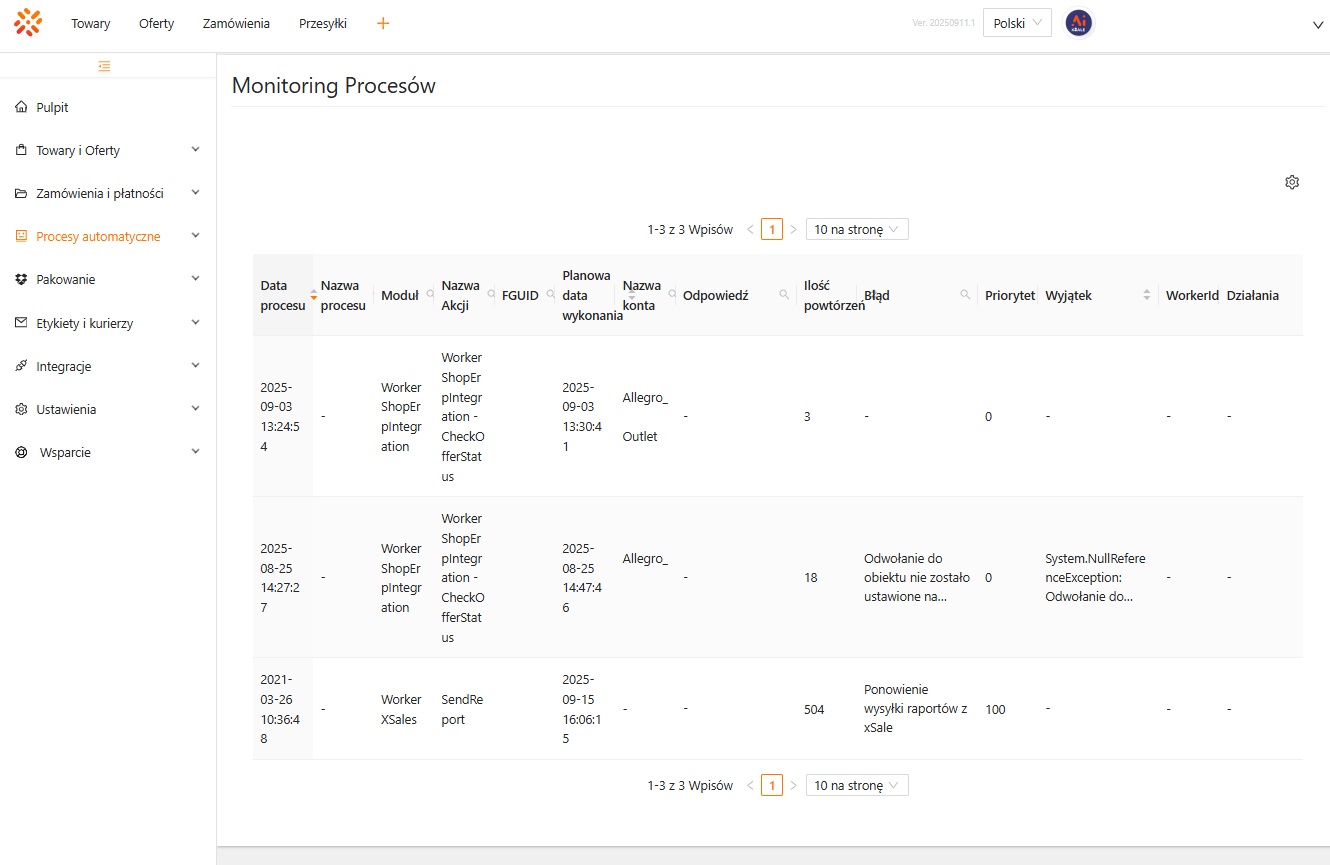 W zakładce Procesy automatyczne -> Monitoring znajdują się informacje umożliwiające weryfikacje procesów, w których wystąpił jakiś problem i nie wykonały się poprawnie. Dzięki temu widokowi można zweryfikować, gdzie pojawił się błąd.