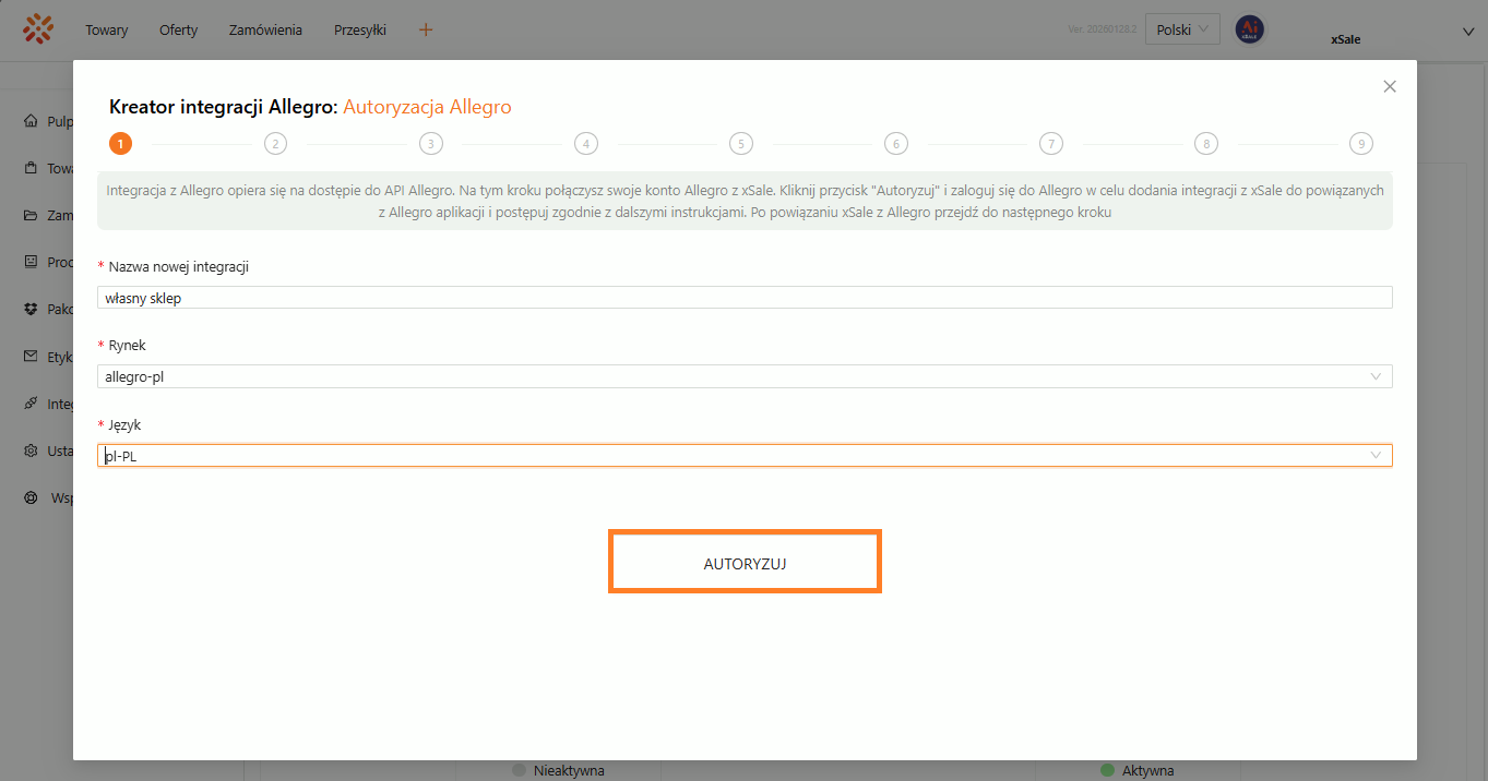 Poniżej przykład pełnego przejścia kreatora integracji Allegro. Ekrany pokazują kolejne kroki w takiej kolejności, w jakiej zobaczysz je w systemie.