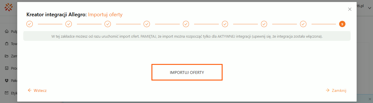 Kreator integracji Allegro — krok 13 Krok 13. W zakładce Integracje zobaczysz, że masz już pierwszą integrację jako aktywną. Możesz wrócić do Pulpitu (ekran główny).