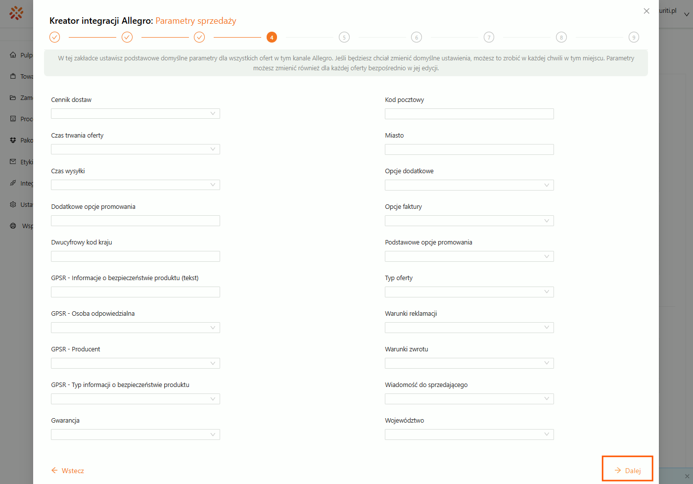 Krok 7. Parametry sprzedaży (głównie GPSR) można na tym etapie pominąć — później będzie możliwość ich uzupełnienia.
