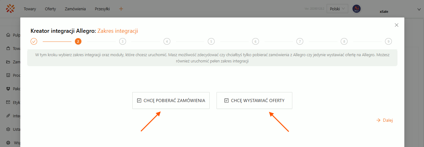 Krok 5. Najlepiej zaznaczyć Zamówienia i Oferty, bo dzięki temu od razu uzupełnią się dane o zamówieniach i ofertach — przetestujesz system na prawdziwych danych.