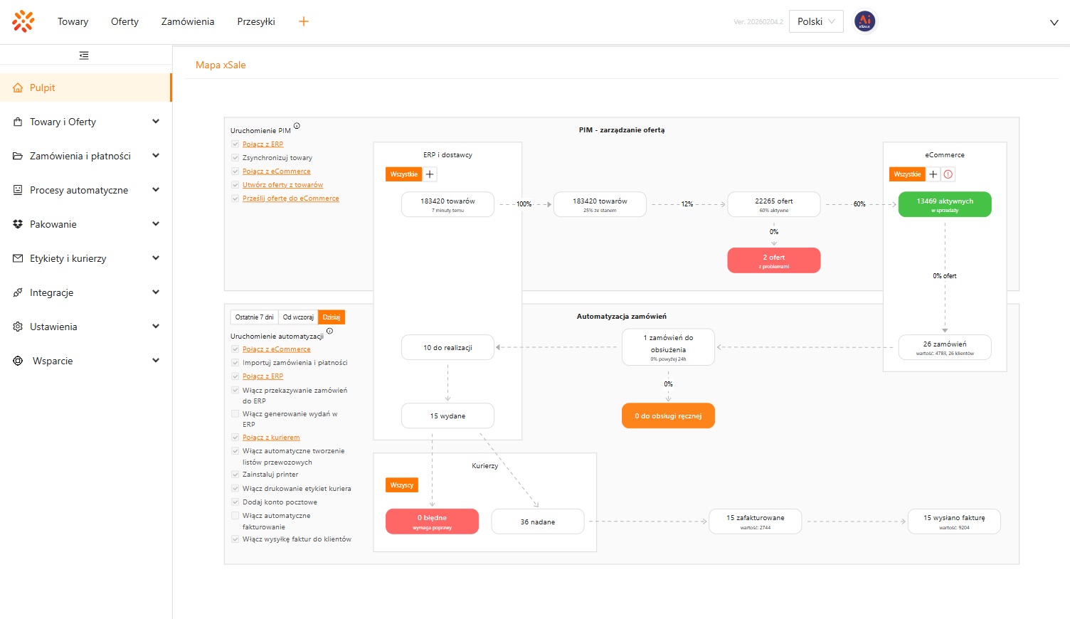- PIM — zarządzanie ofertą: widać przepływ danych między ERP/dostawcami, xSale i eCommerce oraz podsumowania dla towarów i ofert (w tym elementy wymagające uwagi).