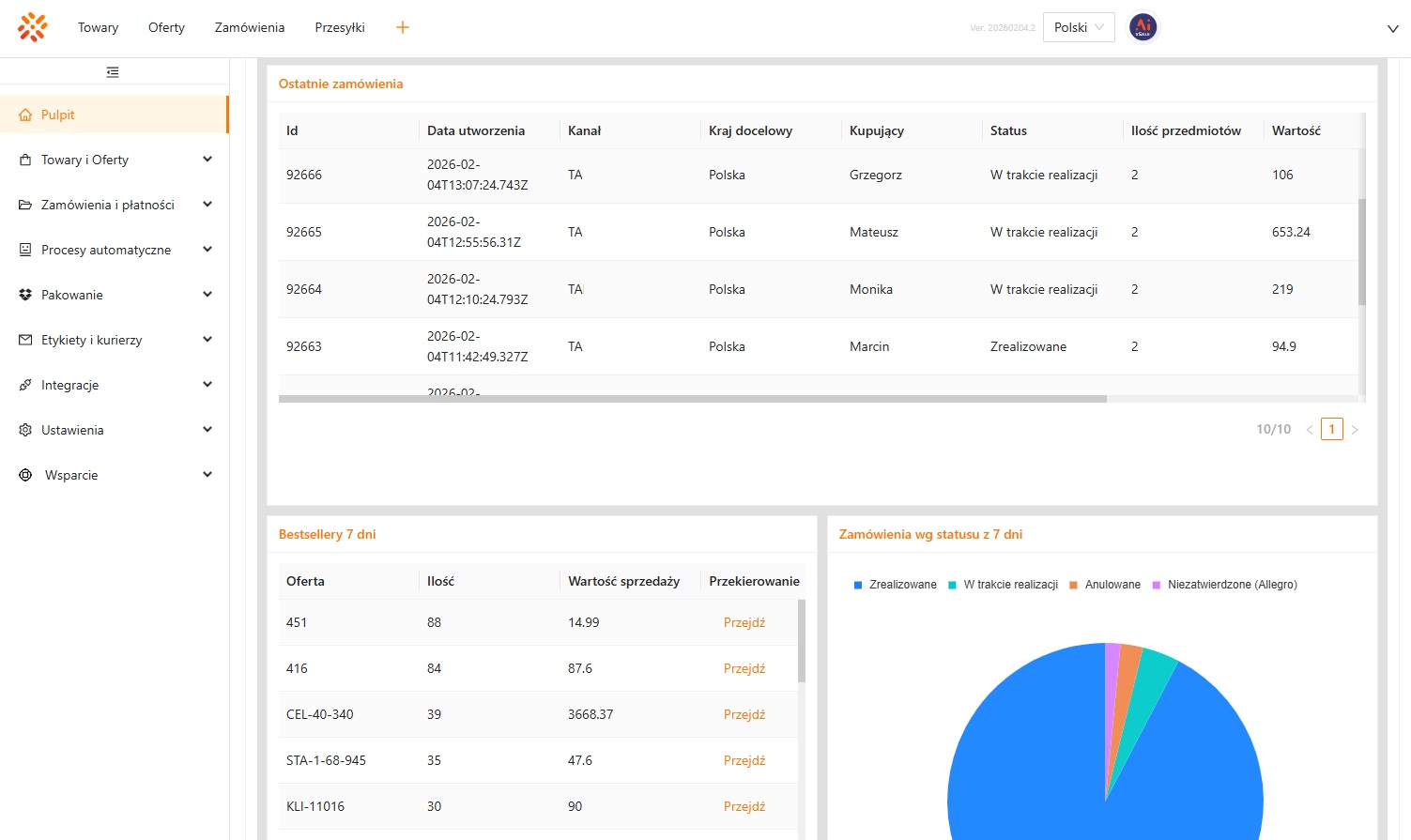 - Automatyzacja zamówień: podsumowanie kolejki pracy oraz wyjątków, które wymagają obsługi ręcznej.