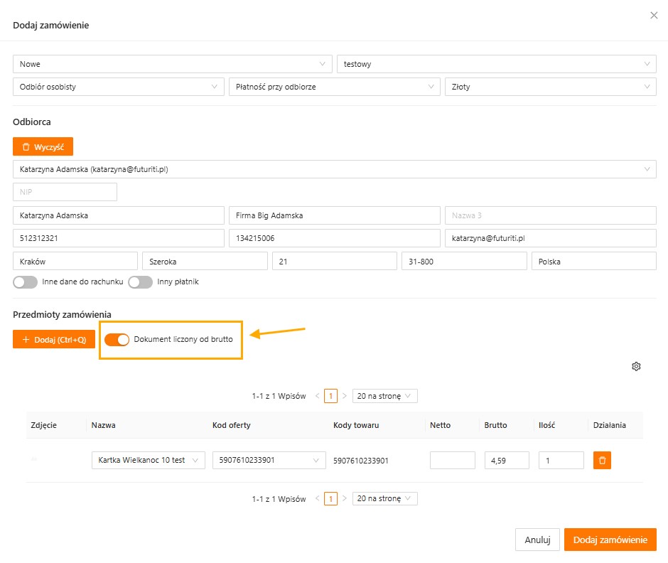 Dokument liczony od brutto przy dodawaniu zamówienia