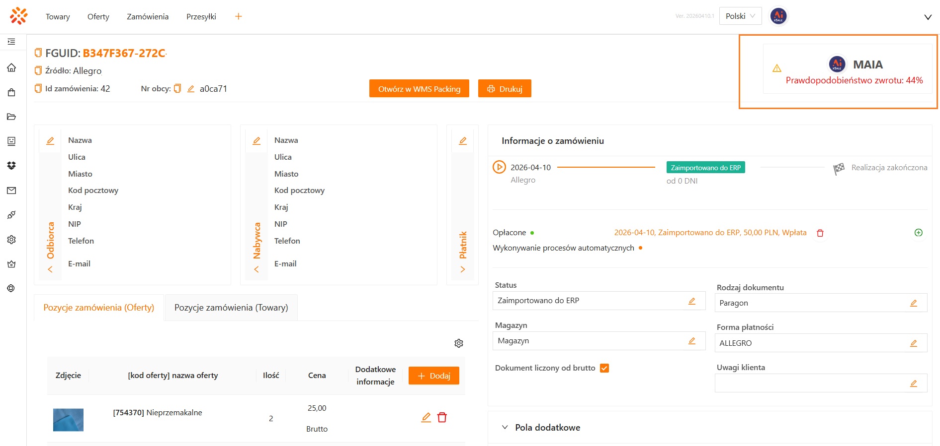 | Uwaga: Prawdopodobieństwo zwrotu jest wskazówką pomocniczą dla operatora. Nie blokuje ono automatycznie dalszej obsługi zamówienia i nie zmienia samodzielnie statusu zamówienia. |