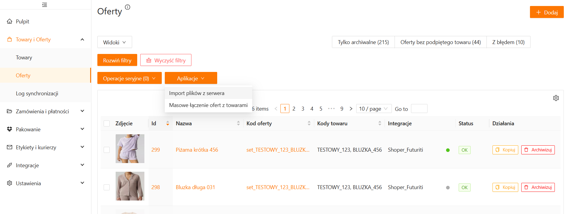 Przejdź na listę ofert (zakładka Towary i Oferty – Oferty) i najedź na menu Aplikacje. Następnie kliknij pozycję Import plików z serwera, aby uruchomić okno importu.