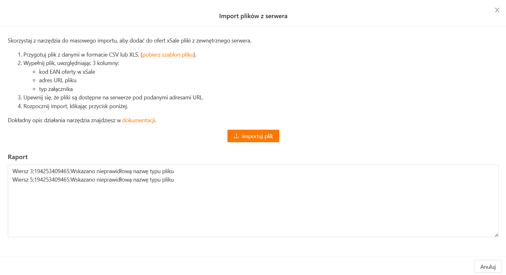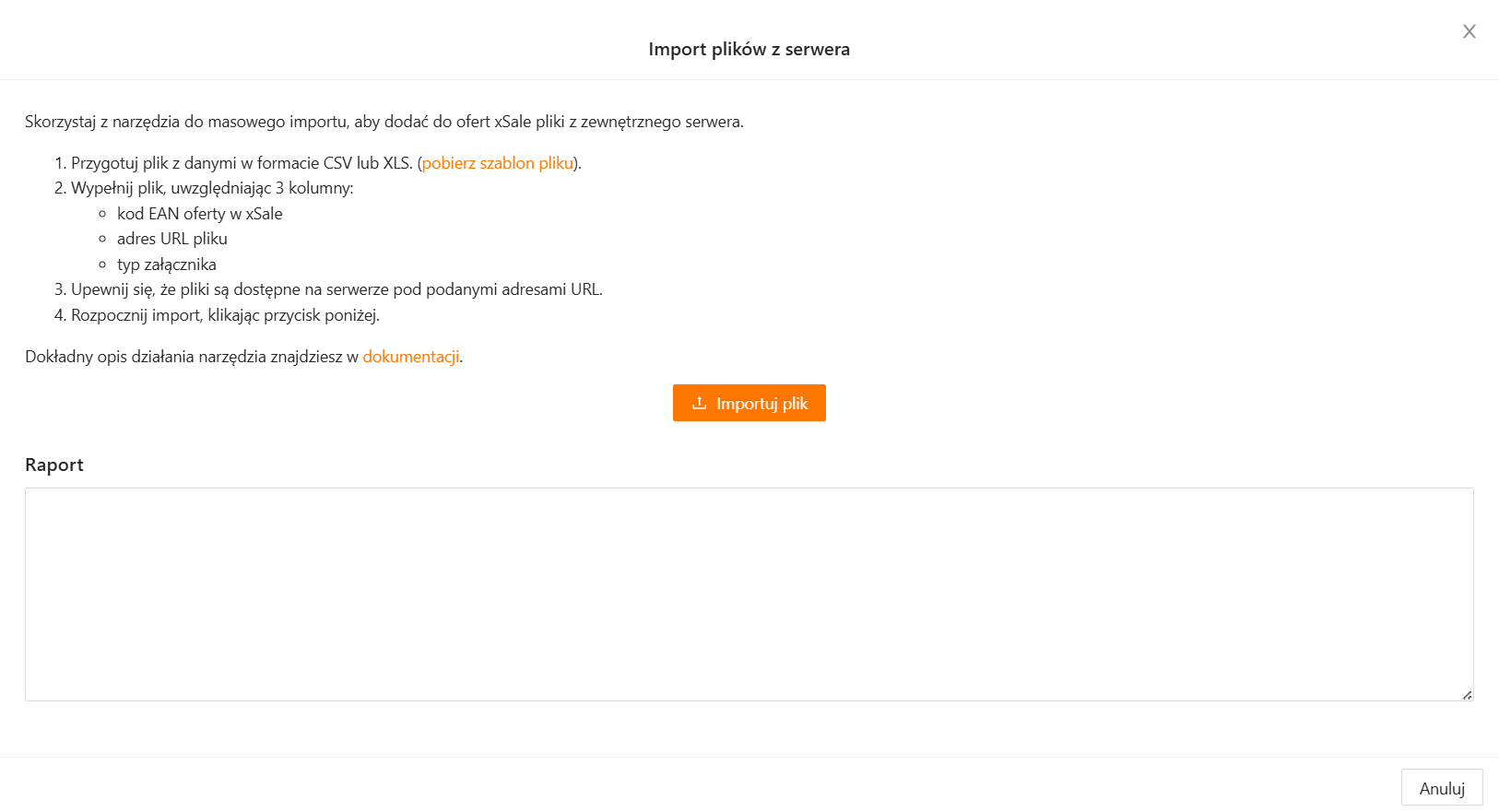 Masowy import załączników jest oparty o pliki dodane na zewnętrznym serwerze. Aby było możliwe pobranie i zapisanie plików w ofertach xSale, musisz znać adresy URL. Dostęp do tych plików nie może być w żaden sposób blokowany po stronie serwera – powinny one być dostępne z poziomu przeglądarki internetowej, bez żadnego logowania itp., np. tak, jak ta grafika (kliknij, aby otworzyć) lub ten plik PDF (kliknij, aby otworzyć).