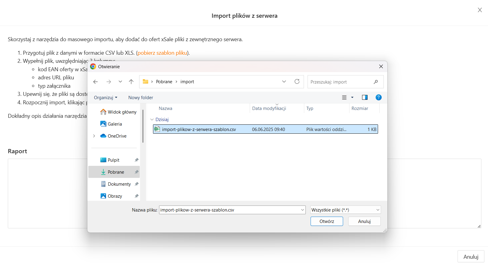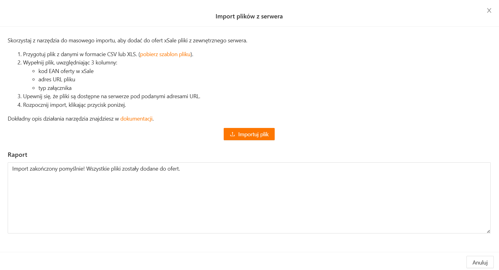 Gdy import zakończy się sukcesem, w oknie wyświetlającym Raport zobaczysz komunikat: Import zakończony pomyślnie! Wszystkie pliki zostały dodane do ofert.