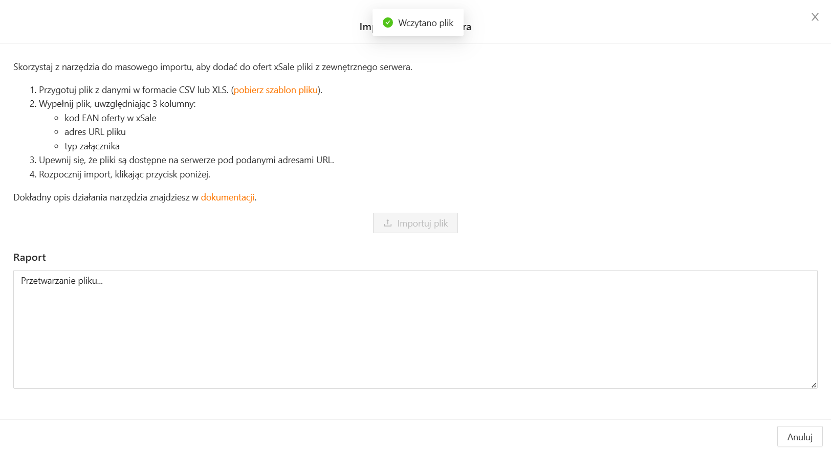 Zatwierdź wybór, aby pobrać wskazany plik do xSale i rozpocząć import plików do ofert. Zobaczysz komunikat Wczytano plik, a w oknie raportu pojawi się informacja o rozpoczęciu przetwarzania danych. Raport jest aktualizowany w czasie rzeczywistym, a sam proces importu odbywa się w tle.