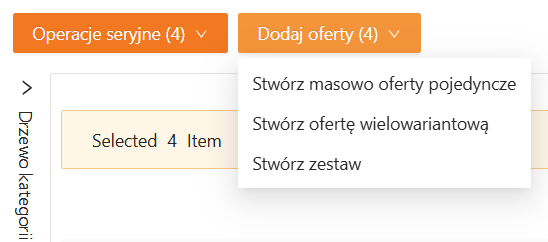 Aby masowo dodać oferty to wybranych towarów, skorzystaj z wybranego przycisku akcji w sekcji Dodaj oferty. Zaznacz na liście towary, dla których chcesz opublikować oferty i wybierz typ ofert do stworzenia (pojedyncze, wielowariantowe lub zestawy towarów).