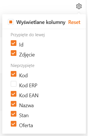 Zawartość tabeli możesz dostosować, klikając ikonę koła zębatego. Aplikacja wyświetli okno umożliwiające wybór Wyświetlanych kolumn. Ustaw widoczność i kolejność kolumn zgodnie z własnymi preferencjami oraz ukryj te, których nie potrzebujesz. Możesz przywrócić domyślne ustawienia klikając przycisk Reset.